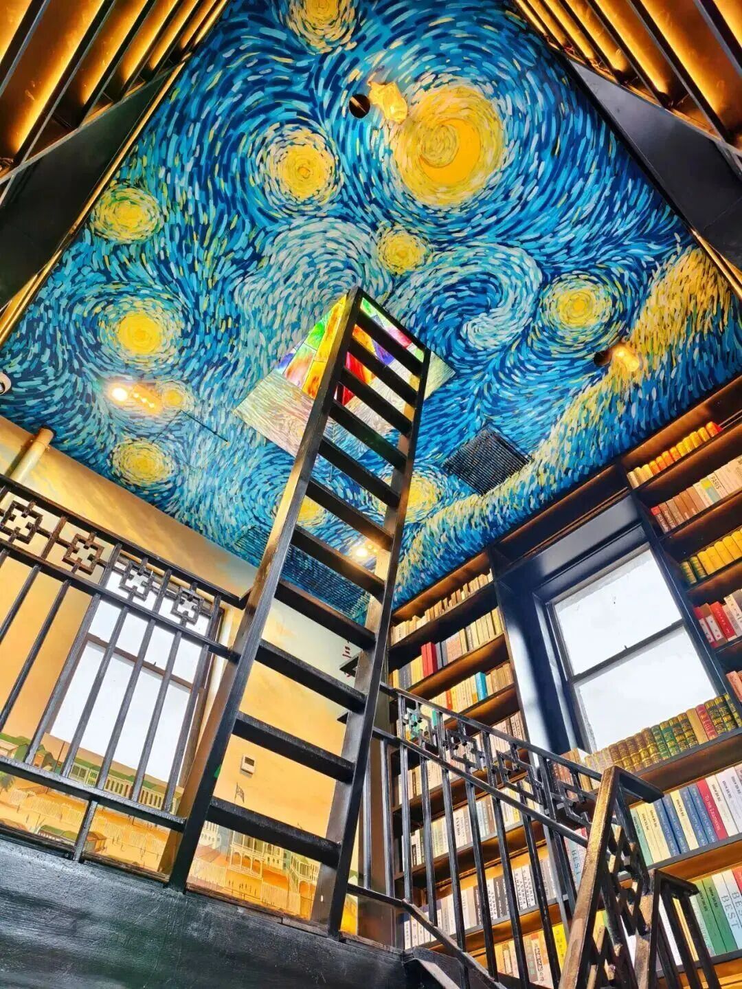 沿着黑色旋转楼梯拾级而上,仿佛穿越“海上丝绸之路”的历史长廊。直至塔顶,梵高的《星空》彩绘与彩色玻璃窗交相辉映,让你在知识的海洋里,亦能仰望星空,思考未来。