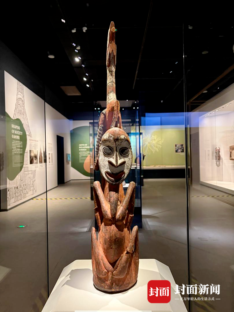 采访中,贾怡君提到了此次展览中亮相的重磅展品,一件独木舟船首雕塑dogai。“我们本次共有40件展品都是首次从法国离境展出,特别是这一件,也可以算作凯布朗利博物馆的‘镇馆之宝’了,是目前仅有的几件之一。”据现场介绍,dogai是托雷斯海峡岛民传统航海信仰中的重要神灵,dogai形象常出现在西托雷斯海峡的独木舟上,被视为赋予舟灵性与庇护力量的象征。